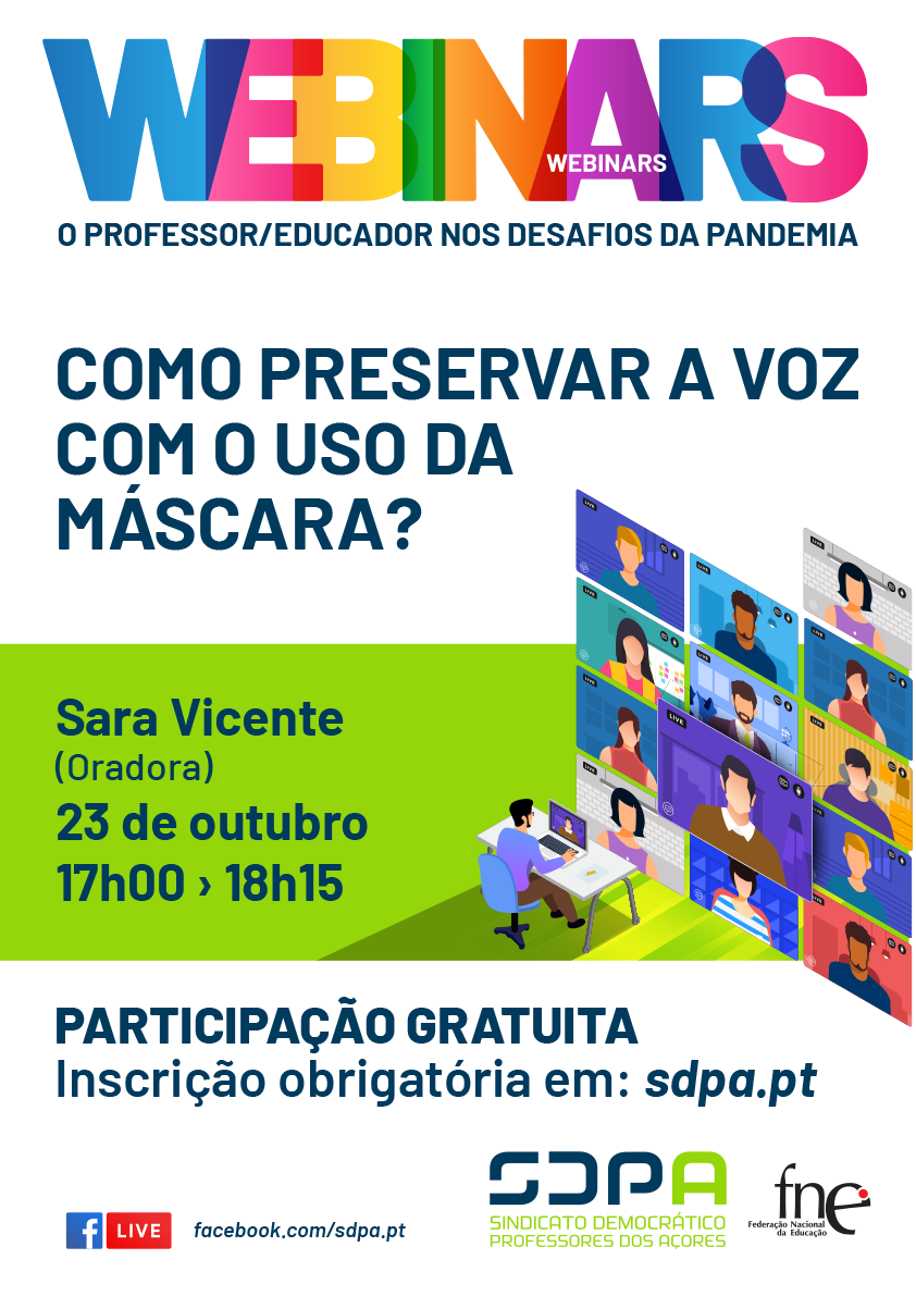 Os nossos colegas e amigos do Sindicato Democrático dos Professores dos Açores (SDPA) realizam no dia 23 de outubro de 2020 (sexta-feira), entre as 17h00 e as 18h15 (18h00 – 19h15 hora do continente), o webinar “Como preservar a voz com o uso da máscara?”, com a intervenção da terapeuta da fala Sara Vicente, com a participação de Ricardo Baptista, presidente da direção do SDPA e com a moderação de Filomena Morais, diretora do PROForma - Centro de Formação do Sindicato Democrático dos Professores dos Açores.