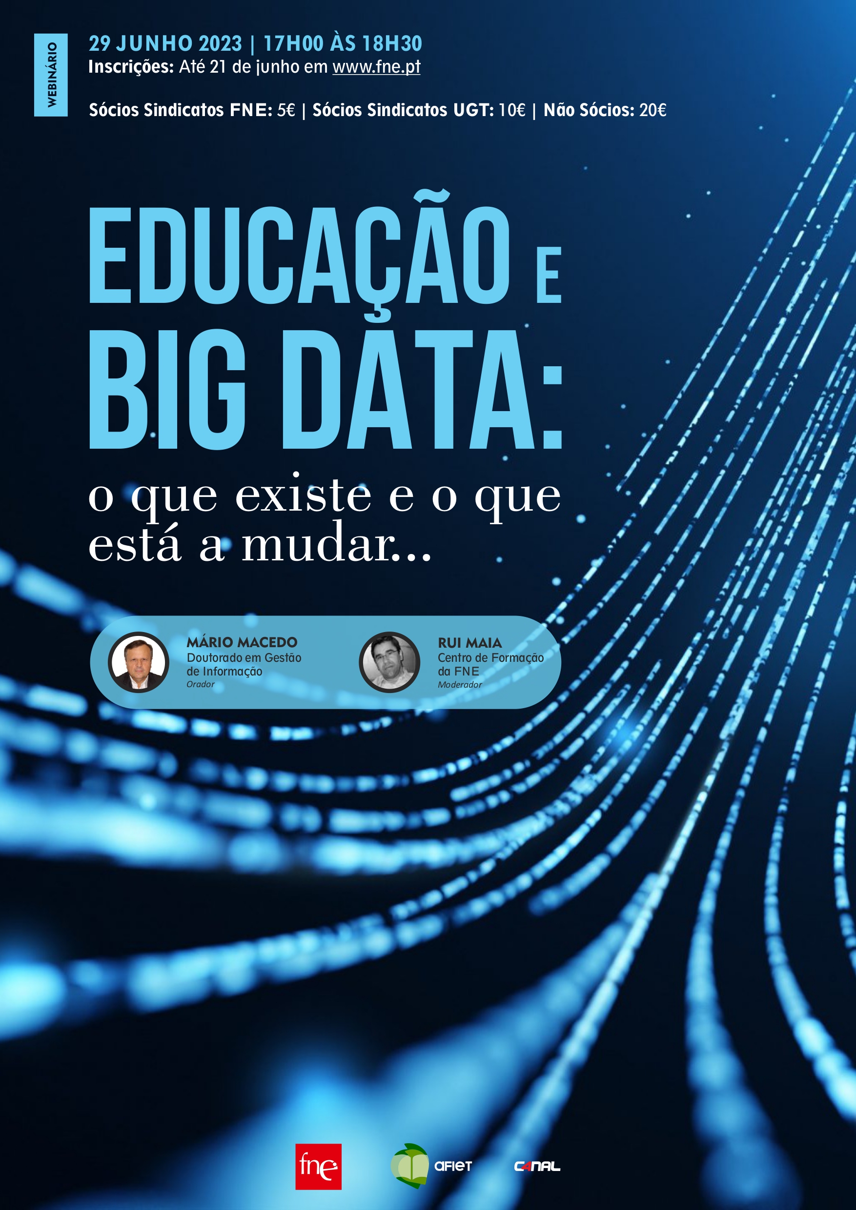 A FNE e a AFIET (Associação para a Formação e Investigação em Educação e Trabalho) promovem, no próximo dia 29 de junho de 2023, entre as 17h e as 18h30, o webinário "Educação e BIG DATA: o que existe e o que está a mudar...", aberto a todos os públicos interessados.